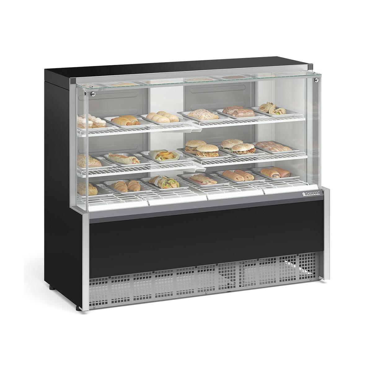 É para aquecimento e exposição de salgados. O espectro de temperatura é regulável entre +30°C a +65°C. As dimensões do produto são de 1,40 m de frente, 1,15 m de altura e 63,2 cm de profundidade.